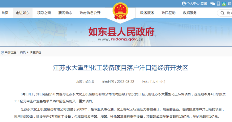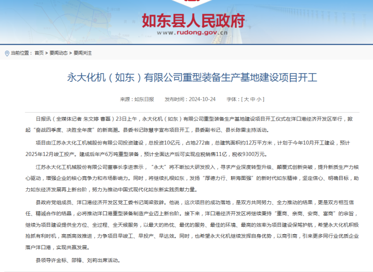 但据如东县东谈主民政府2024年10月发布的信息暴露,永大化机(如东)有限公司重型装备分娩基地名堂总投资达10亿元,策动于2024年10月开工,2025年12月完满,成立周期仅14个月,达产后年产能为6万吨重型装备,瞻望应税销售11亿元。