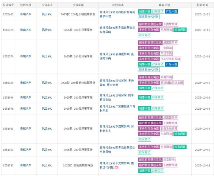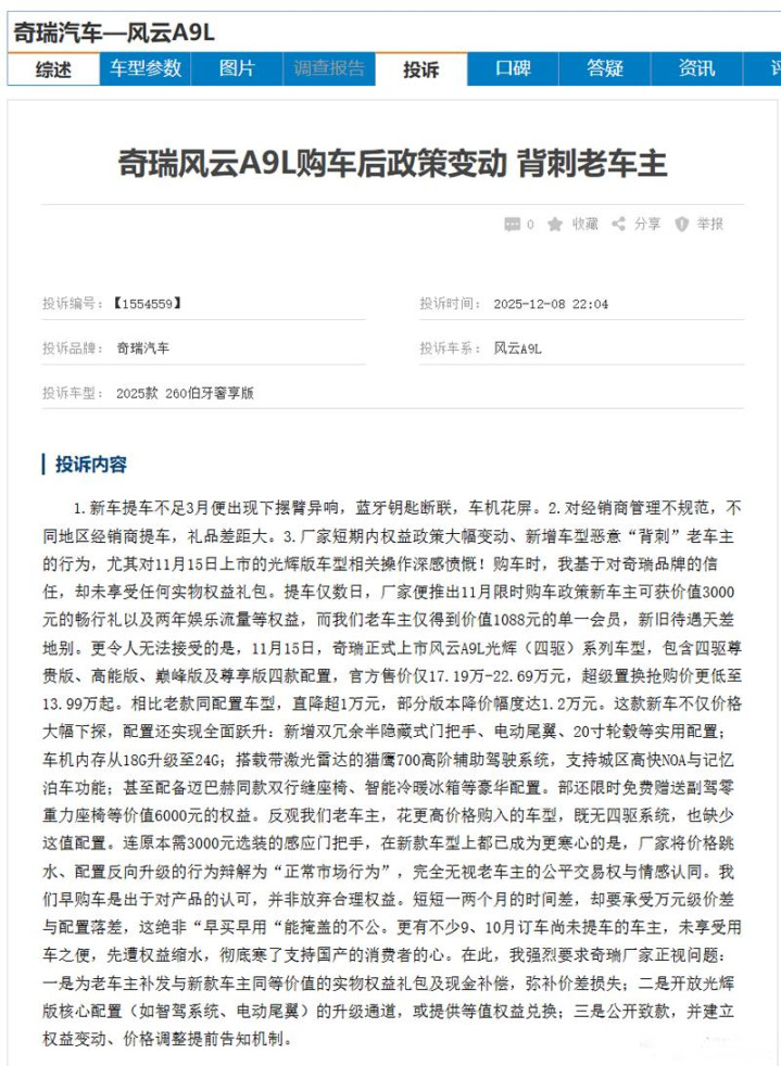 据第三方汽车投诉平台自满,奇瑞风浪A9L近期被大齐车主集会投诉,中枢诉求围绕销售计谋变动、底盘异响等问题张开。有投诉车主知道,新车提车不及3个月,便接连出现下摆臂异响、蓝牙钥匙断联、车机花屏等故障,此外不同地区经销商提车礼品差距悬殊,更让车主难以接管的是厂家短期内的权益和价钱调遣。